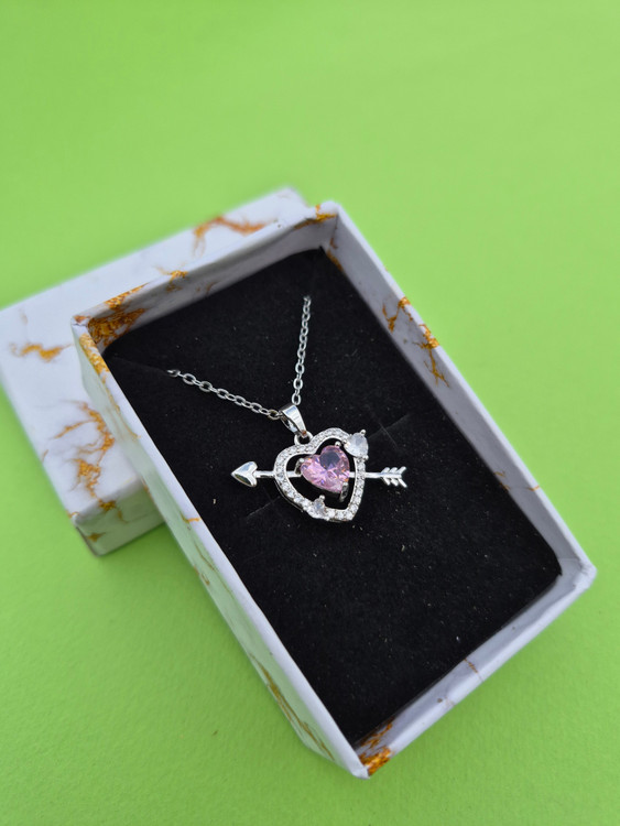 گردنبند قلب و تیر صورتی با طراحی فانتزی و جذاب، نمادی از عشق و دوستی است. این اکسسوری با رنگ صورتی ملایم، انتخابی عالی برای دختران جوان و نوجوان است.