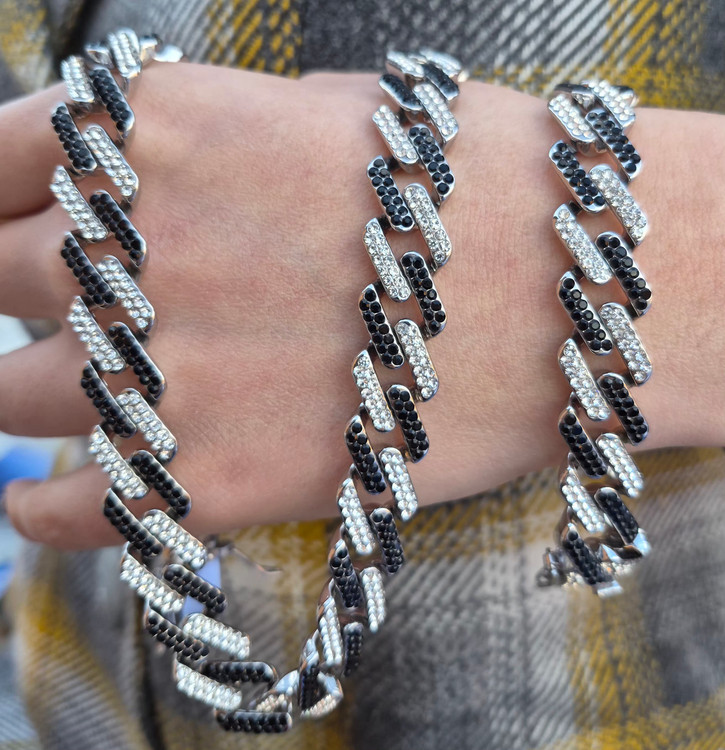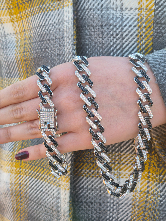 این ست جذاب و خیرهکننده شامل گردنبند و دستبند طرح کارتیر است که با نگینهای درخشان مشکی و نقرهای پوشانده شده است. طراحی مدرن و کیفیت بالای این محصول، آن را به انتخابی عالی برای مجالس و هدیه دادن تبدیل کرده است.