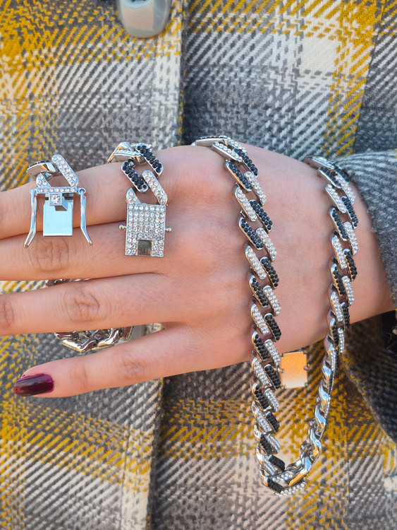 ست کارتیر فول نگین مشکی نقره ای با قفل کوبایی