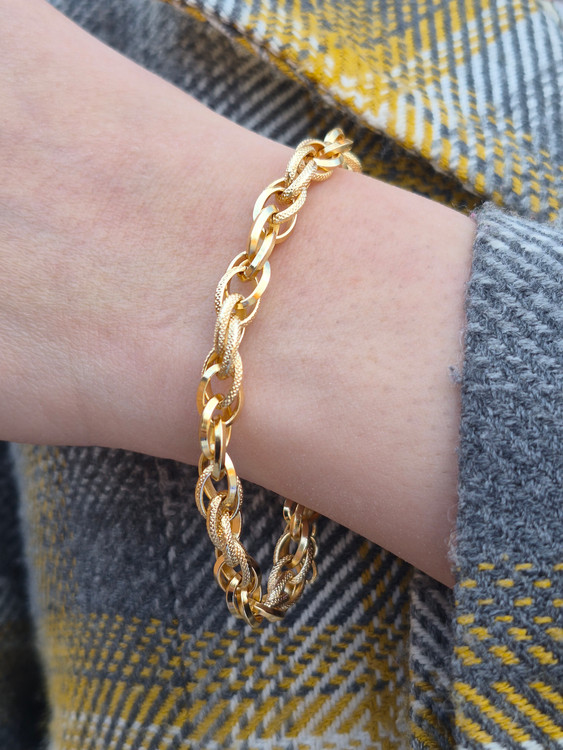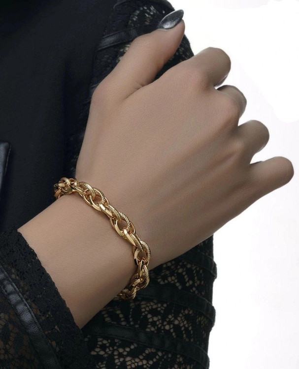 این دستبند با طراحی زنجیری ظریف و درخشان، شباهتی چشمگیر به طلا دارد و بهراحتی با انواع استایلها – از روزمره تا رسمی – ست میشود.